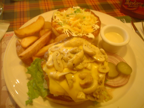 起司磨菇堡 -----> 讚阿!!漢堡內大塊牛肉的嚼勁真不是外面餐廳隨便吃的到的,薯條是用整顆馬鈴薯去削製成,搭配醬更美味!!價位約NT260